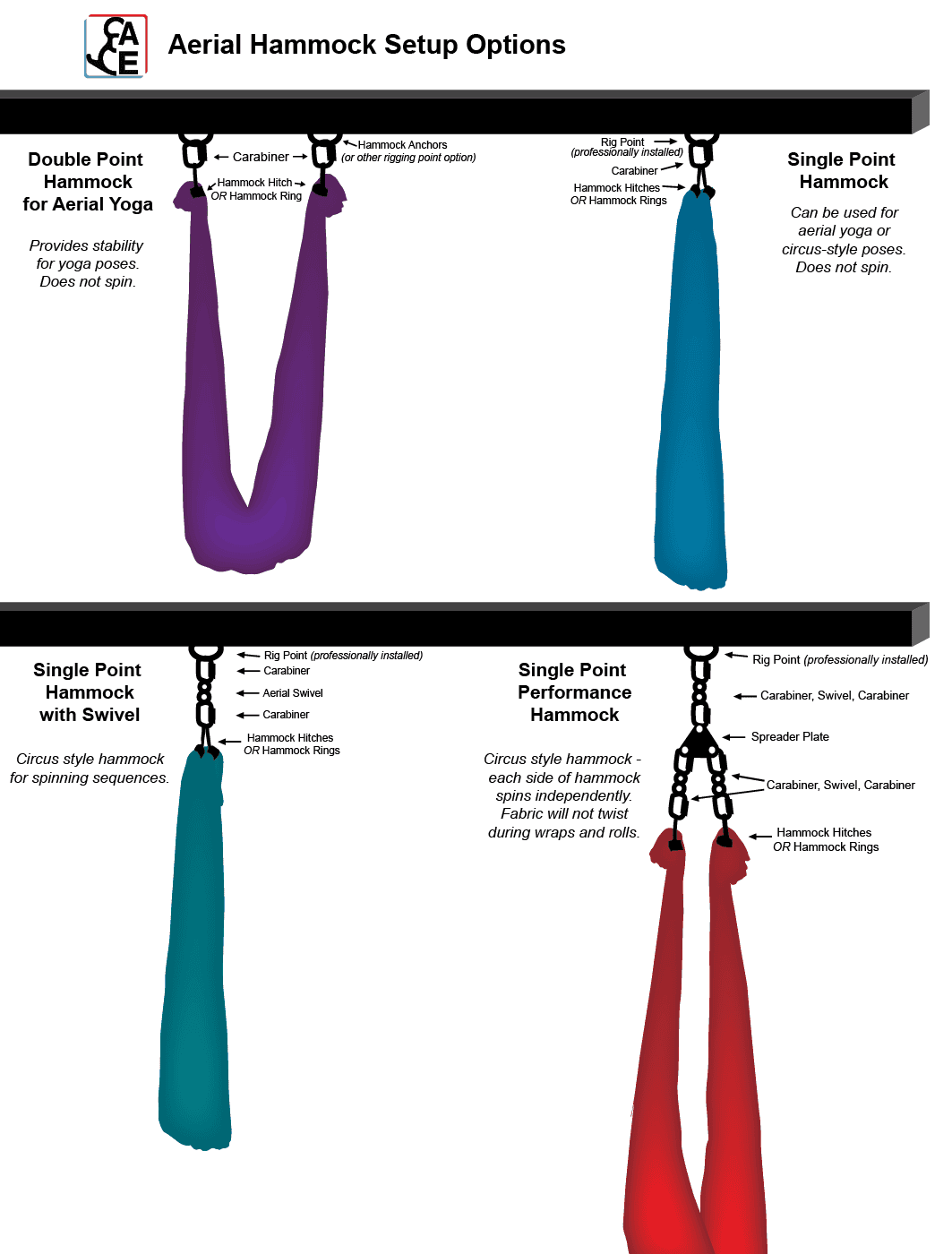 There are several ways to rig your Aerial Yoga Hammock, as shown in the diagram below.